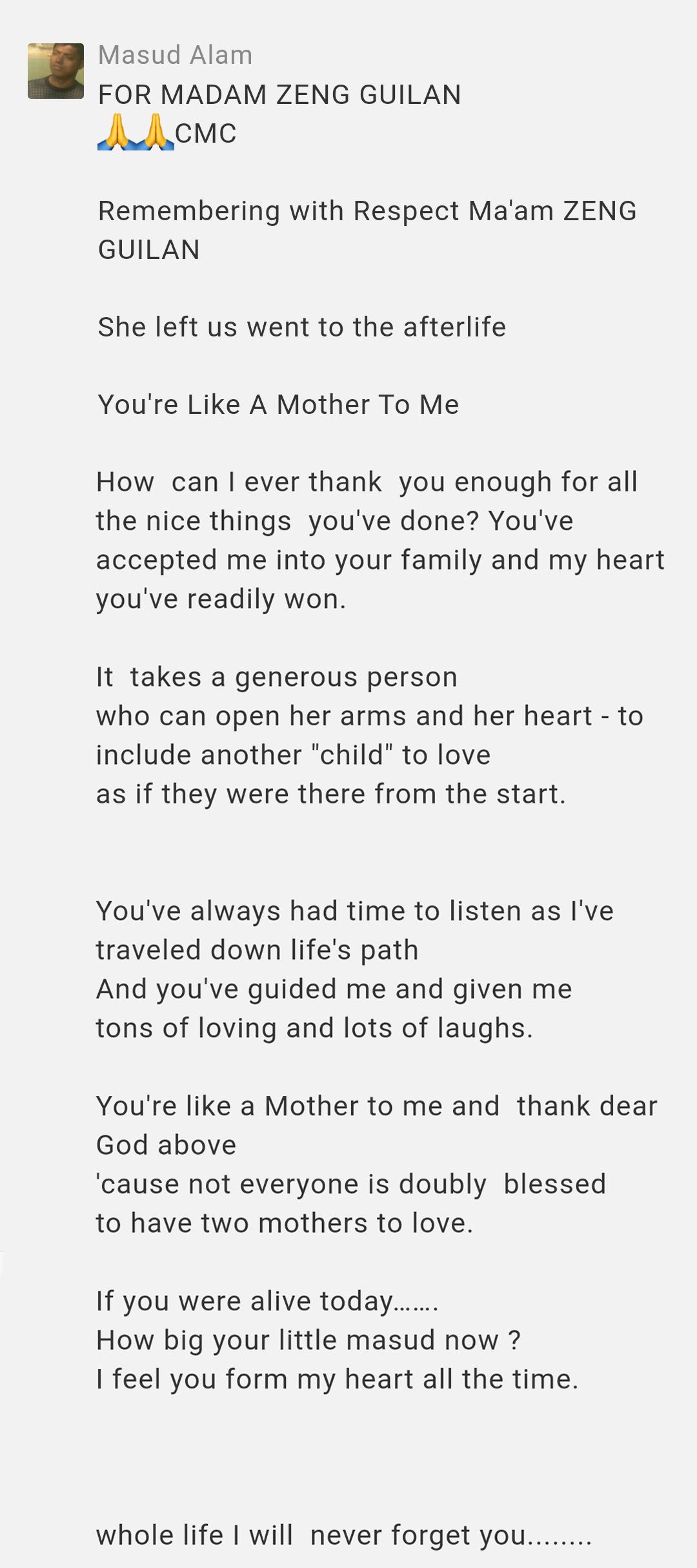 将马苏带回项目办的曾桂兰后期因病回国,在临终前,她依然惦记着这个孟加拉的孩子,给他写信鼓励他好好学习,获取独立生活的本领。马苏不负众望地做到了,他心中始终记着这份来自中国的“母亲”和中方企业的恩情: