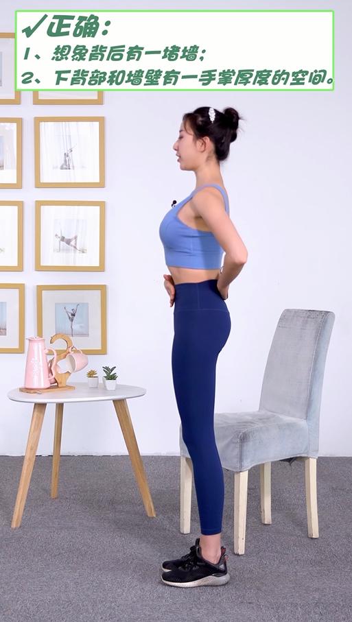 ②正确站姿:站立,微屈膝,保持肩、耳、髋、膝、踝在一条直线上,想象后背有一面墙,背部和墙壁之间有一个手掌的空间。