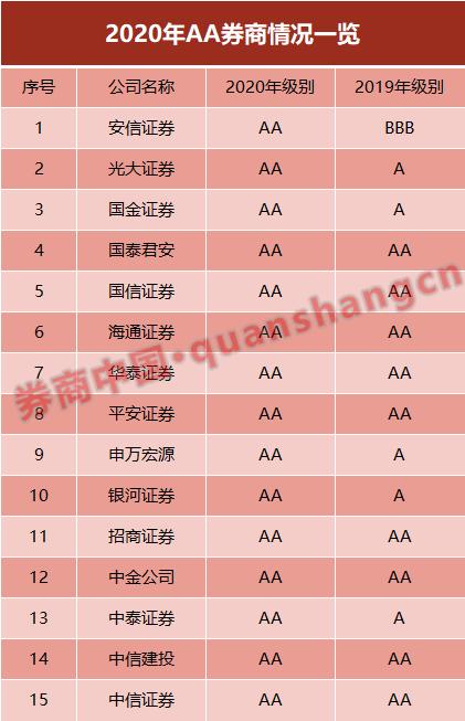 共有15家券商在2020年获得AA殊荣,分别是:安信证券、光大证券、国金证券、国泰君安、国信证券、海通证券、华泰证券、平安证券、申万宏源、银河证券、招商证券、中金公司、中泰证券、中信建投、中信证券。
