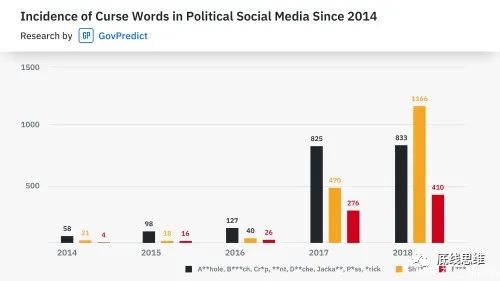 我这话毫不夸张,美国两院议员一共五百来人,根据政治分析公司GovPredict的统计,2014年他们说脏话被记录在案的一共有83次,15年132次,16年193次,截至这时还可以说是少数老鼠屎搅坏一锅汤,可自懂王登基以后,17年1571次,18年2409次。19年前三个季度就1898次了,今年受疫情和选举影响,骂脏话只会多不会少,等着看统计数据吧。而且这还只统计了区区十个脏字,分成三类,一是f***,二是shit,三是杂项,其实英语里还有很多骂人的话,都没有被收录进去,就这已经比几年前翻了几百倍了,可想而知现在美国政坛就是祖安大区,议会就是各州的文科状元在吵架。