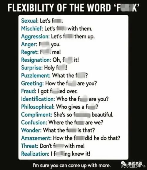 这个词意思很丰富,可以是名词动词形容词甚至叹词,放哪儿都能用,但总体上说它是最不堪入目的字眼,国家领导人在公开场合说这个词,会让不少美国大爷大妈感到三观尽毁。经常看美剧或者听说唱的朋友大概有种印象,觉得美国人一讲话满嘴不是屎尿屁就是生殖器,让他们不带脏字,就好像让意大利人不打手势,立马就不会说话了。其实这是我们的一种刻板印象,美国当然有这样的人,而且往往在文化领域里还很活跃,但并不意味着普罗大众都这样。