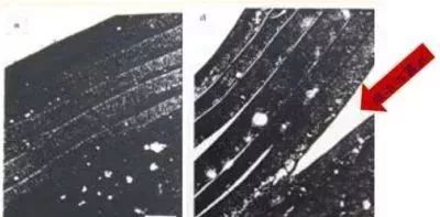 右边为紫外线照射的头发,毛鳞片开裂