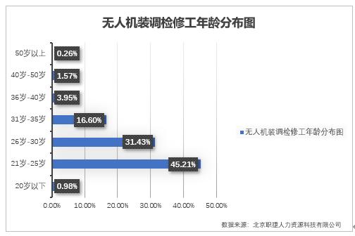 从数据分析,无人机装调检修工就业队伍中21岁-30岁占总人数高达76.64%,其中21岁到25岁之间占就业岗位总人数的45.21%,此类人员大部分都在相关无人机生产企业从事无人机装调工作。无人机装调检修工队伍的年轻化与实际动手能力需求高度契合岗位的需求,体现无人机装调检修工队伍的特色。