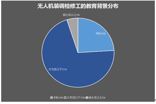 不难发现无人机装调检修工的学历主要为大专及以下,占比71%,无人机装调检修工就业门槛低,但是随着无人机产品的转型升级,无人机装调检修技能型人才缺口日渐显现,此时“无人机装调检修工”新职业推出,可以帮助企业破解转型升级过程中所面对的人才困境,为企业提供高端人才的有效供给,同时,帮助企业在效益上有所提升,让企业真正找到“用得起”的人才。
