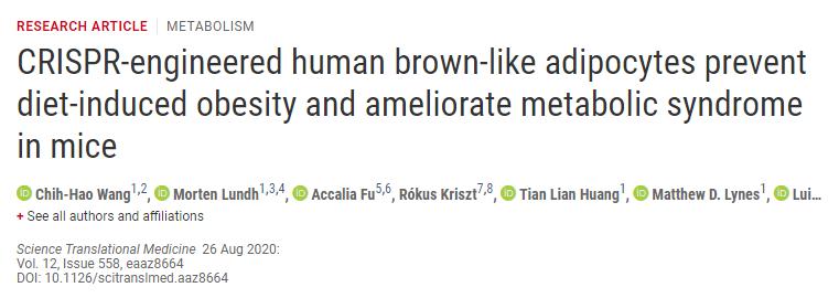 该研究在8月26日发表在《科学转化医学》杂志上,题为“CRISPR-engineered human brown-like adipocytes prevent diet-induced obesity and ameliorate metabolic syndrome in mice”。