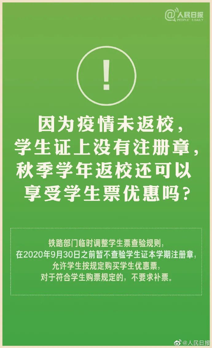 铁路部门回应因疫情未返校学生证无注册章:临时调整学生票查验规则,在2020年9月30日之前暂不查验学生证本学期注册章,允许学生按规定购买学生优惠票,对于符合学生购票规定的,不要求补票。