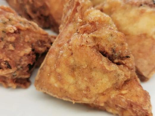 必须赶紧吃!刚出炉的炸豆腐角,香气十足,酥得掉渣。用牙齿轻轻咬一口,“噗”的一声,外皮的油就溅弹进口腔,豆腐角里面鲜嫩清香的豆腐脑也随着牙齿的咬破而蹦出来,刚经历了酥脆外皮香脆口感的舌尖,马上又进入又嫩又香的感觉,在短短的时间内,就饱尝了两种截然不同的美妙的体验。