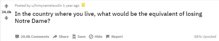 去年巴黎圣母院被烧的消息出来后,有人在reddit上提问:“你生活的国家失去什么等同于巴黎失去圣母院?”