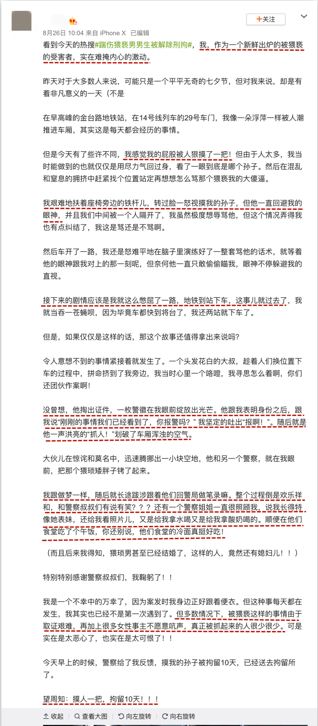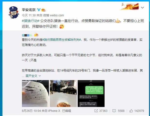 8月26日,北京一位姑娘在新浪微博写下了长段爽文讲述了被猥亵后经历的天降正义。