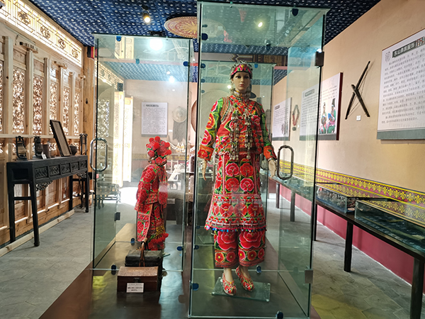 走出凹六十妹家,我们来到大三家彝族民俗展厅。展厅于去年7月份开工,今年2月份完工,占地160平方米,是大仓镇新胜村委会大三家村民族团结进步示范村建设项目中的一项。展厅内展示的均为大三家本地彝族特色物件,包括彝族传统民族服饰,生产生活所使用的犁、马鞍、石磨以及节庆日所使用的唢呐、大刀等器物。
