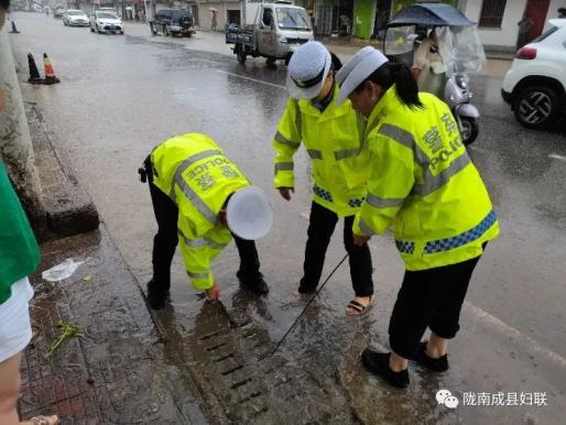 在城区,每次暴雨都会发生内涝现象,尤其是在同谷北路妇幼保健站、东街小学附近最为严重。这次强降雨天气,内涝现象仍然不能避免。中队执勤女辅警毅然向前,趟着没过小腿的冰凉的雨水,指挥车辆,疏导交通,照顾行人,并且竭尽全力涉水前行,将小朋友们抱过马路。此时此刻,小朋友的一个笑脸,一声“谢谢阿姨”,足以让她们驱走雨水的凉意,坚定“我们能行”的信心。而很多女辅警的家人和孩子,那时候她们却顾不上照顾。