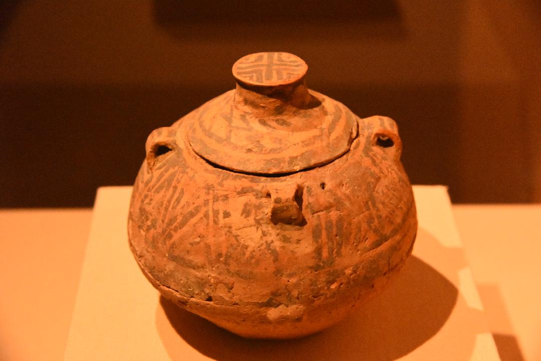 展出斜线纹带盖罐,四坝文化,1976年甘肃省玉门市火烧沟遗址出土第二单元笔画与色调的奏鸣