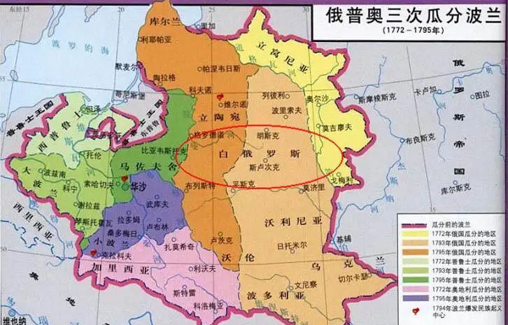 沙俄从一开始就是个野心勃勃的国家,不断向周边扩张。经过一百多年血战,沙俄联合普鲁士、奥地利三次瓜分波兰。1793年第三次瓜分后,白俄罗斯被沙俄吞并。