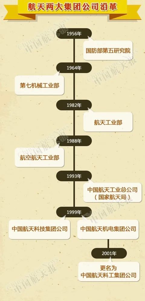 1999年7月1日,经国务院批准,中国航天工业总公司一分为二,分别成立了中国航天科技集团公司和中国航天机电集团公司。2001年7月,中国航天机电集团公司更名为中国航天科工集团公司。2017年底,双方改名为中国航天科技集团有限公司和中国航天科工集团有限公司。