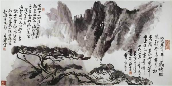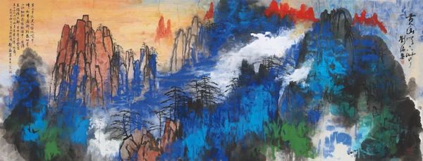 出现在雅集现场的《黄山天下无》 泼彩山水 146×370.5cm 设色纸本