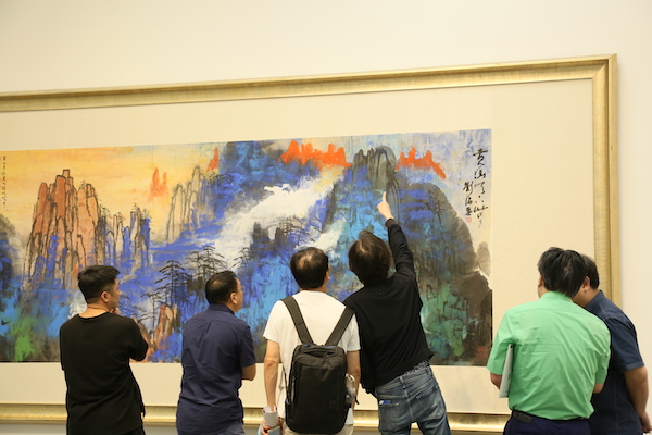 “存天雅集——重看刘海粟”开始前,与会嘉宾讨论一件巨幅作品(非刘海粟美术馆馆藏)