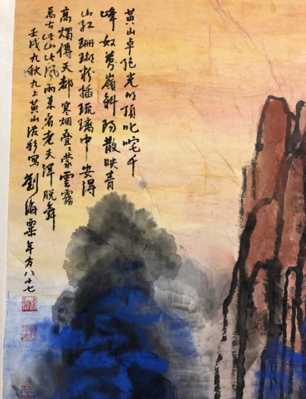 在场的收藏家陈利与刘海粟也有较多交往,近年来也通过拍卖等方式收藏了300余件海老作品,在他的记忆中,1988年9月在上海美术馆开幕的“刘海粟十上黄山画展”并未展出这一《黄山天下无》,如果如画面中显示的这件作品是1982年“九上黄山”时所绘,当时应该会展出。此外,在刘海粟的年谱中也并未见该画的记录。