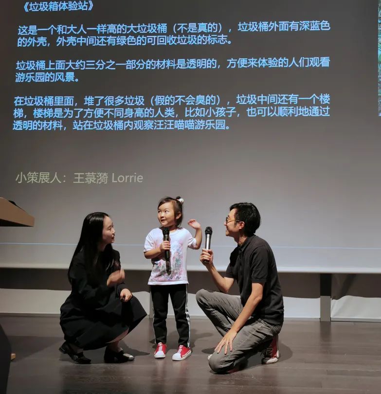 只有4岁半的小小策展人王菉漪也提案“汪汪喵喵游乐园”,她告诉大家:“猫猫狗狗是人类的好朋友,它们需要属于它们的游乐园。那些抛弃小动物的人们,需要去垃圾桶里感受一下痛苦和生命存在的感觉。”