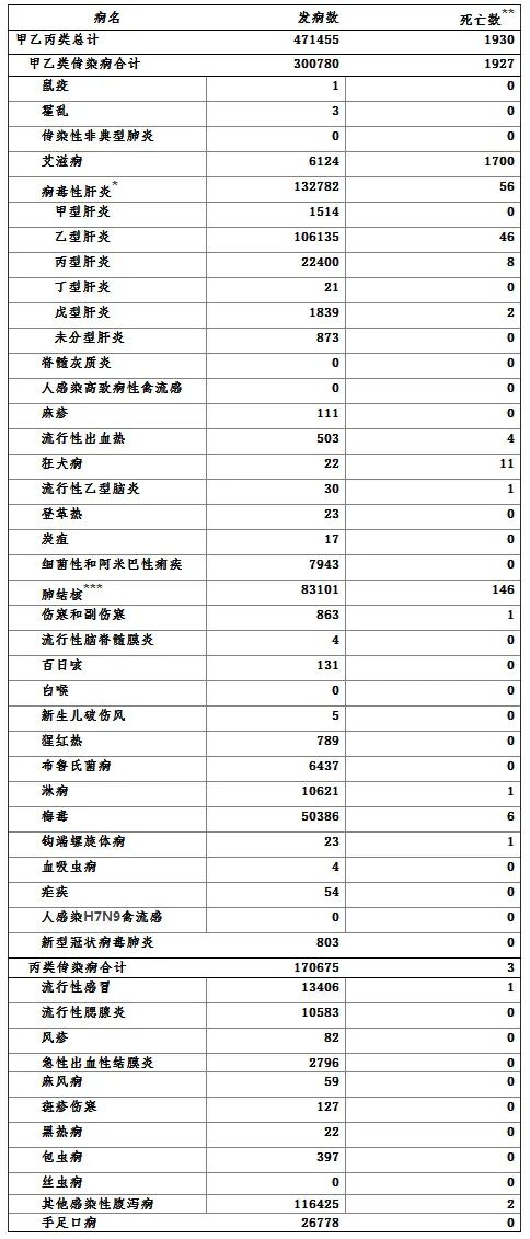 昨日,国家卫健委疾病预防控制局发布今年7月全国法定传染病疫情概况:7月全国(不含香港、澳门特别行政区和台湾地区)共报告法定传染病471455例,死亡1930人。其中,鼠疫报告1例发病,霍乱报告3例发病,无死亡报告。全国31个省(自治区、直辖市)和新疆生产建设兵团报告新型冠状病毒肺炎确诊病例803例,无死亡病例报告。