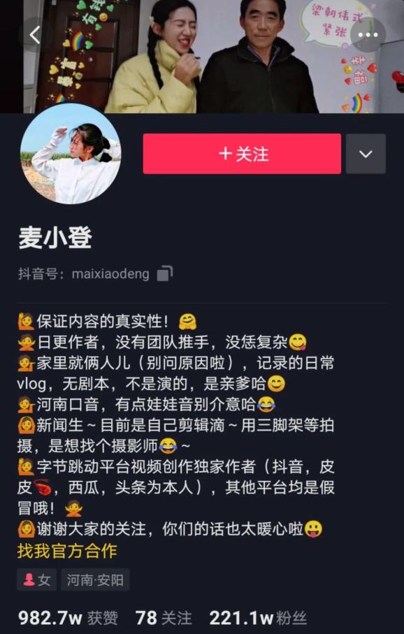 麦小登这样介绍自己,“保证内容的真实性,日更作者,没有团队推手,没恁复杂。家里就俩人儿(别问原因啦),记录的日常vlog,无剧本,不是演的,是亲爹哈。”家在安阳滑县农村的95后姑娘“麦小登”,大眼睛、小V脸,镜头里的她,扎着麻花辫,爱说爱笑,一口河南话带着好听的娃娃音。她拍摄的和爸爸的生活日常,平缓无波,却成为网友爱看的“向往的生活”,展现一幅温馨美好的乡村图景。