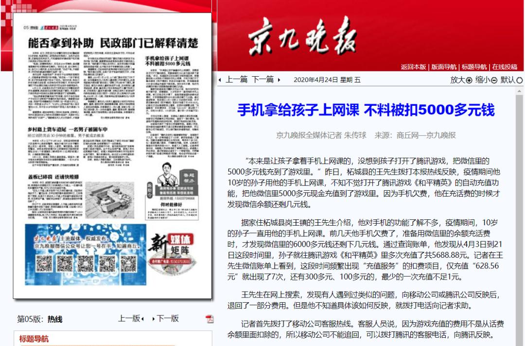 今年4月下旬,新冠肺炎疫情有所缓解,我在采访“商丘网”一个栏目过程中,接到了约10年前一位受访者的电话,柘城县岗王镇腿部残疾的王先生。他的孙子在疫情期间用手机上网课间隙,打开了《和平精英》。在家长不知情的情况下,通过微信绑定的银行卡,累积充值了6000多元。