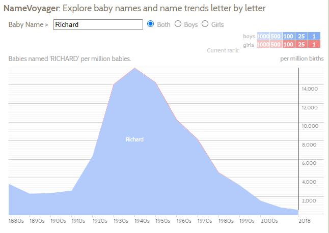 但是,我们的Richard,可能因为名字取得不好,在明尼苏达那档子事后,就很少出来讲话了。其实,作为英文名字的Richard,其实已经不受欢迎了。在美国专业的姓名数据网站babynamewizard上,以Richard作为名字的人是越来越少了。