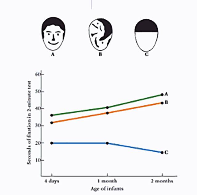 出生几天后,婴儿对具有面部特征的图形更加偏好了,而且这种难以自拔的喜爱一路走高。
