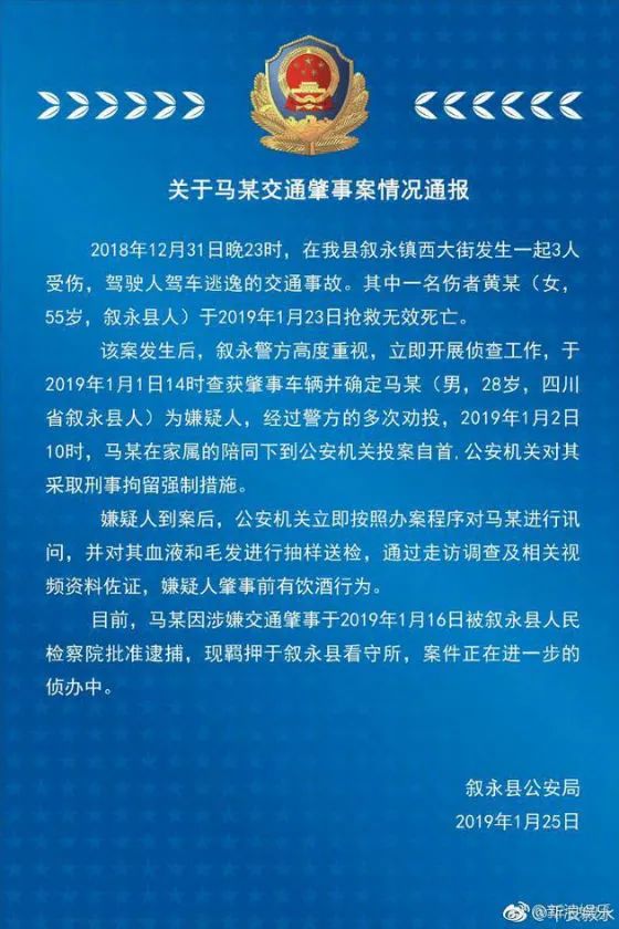 2019年1月,谭松韵经纪人发文透露谭母在跨年夜遭遇严重车祸,经治疗无效离世。随后警方通报,称司机马某肇事逃逸前有饮酒行为,因涉嫌交通肇事于2019年1月16日被批捕。
