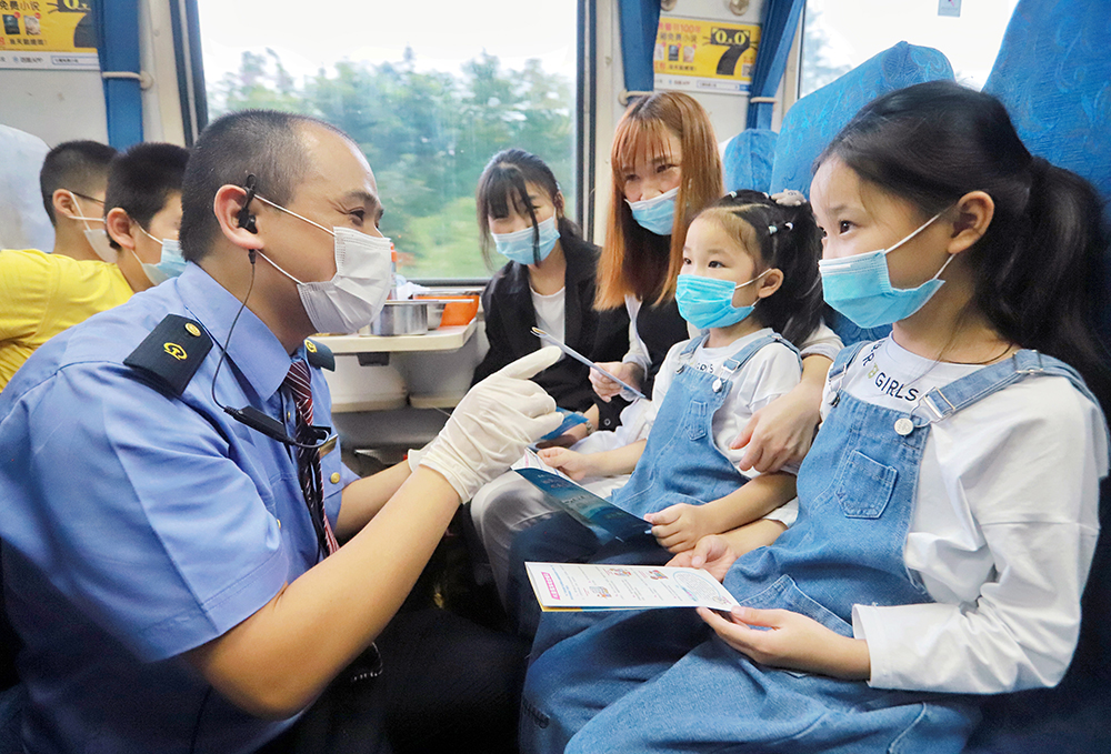 宁波至西安K466次列车上,乘务人员向儿童旅客宣传乘车安全知识。