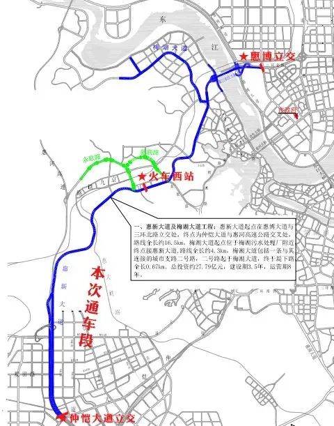 2018年2月,梅湖立交至惠州火车西站段近4.1公里拓宽改造道路率先建成通车;2020年1月,起点三环北路惠博立交至梅湖立交段(含长约958米惠新大道跨东江大桥)近2.6公里路段建成通车。梅湖大道起点位于梅湖污水处理厂附近,终点接惠新大道与梅湖大道立交处,全长约4.9公里,是江南片区的一条主要干道。