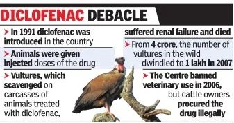 在印度次大陆的一些国家,人们曾大量使用双氯芬酸钠(diclofenac)治疗家畜疾病,但这种药对鸟类是有毒的。大量秃鹫因吃了含有双氯芬酸的家畜尸体而死,没有秃鹫处理腐肉,这些尸体就成了老鼠和流浪狗的美餐,它们的数量因而急剧膨胀。和秃鹫不同,老鼠和流浪狗往往携带对人危险的传染病(如狂犬病),严重危害人们的安全。现在,印度、巴基斯坦和尼泊尔都已禁用双氯芬酸钠,以保护秃鹫。