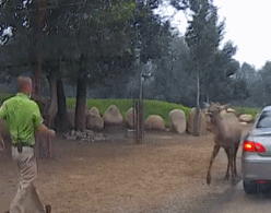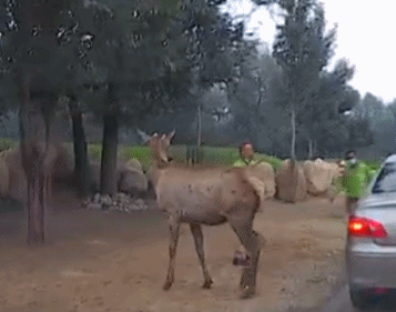 之后饲养员挥手示意让该游客驾车前行。
