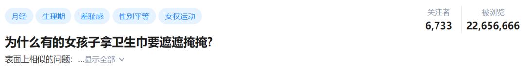 但是,知乎上的另一个问题,代表了我们所处环境中更常见的情况。“为什么有的女孩子拿卫生巾要遮遮掩掩?”这个问题有超过2200万的浏览量,远超上一个关于卫生棉条的讨论。