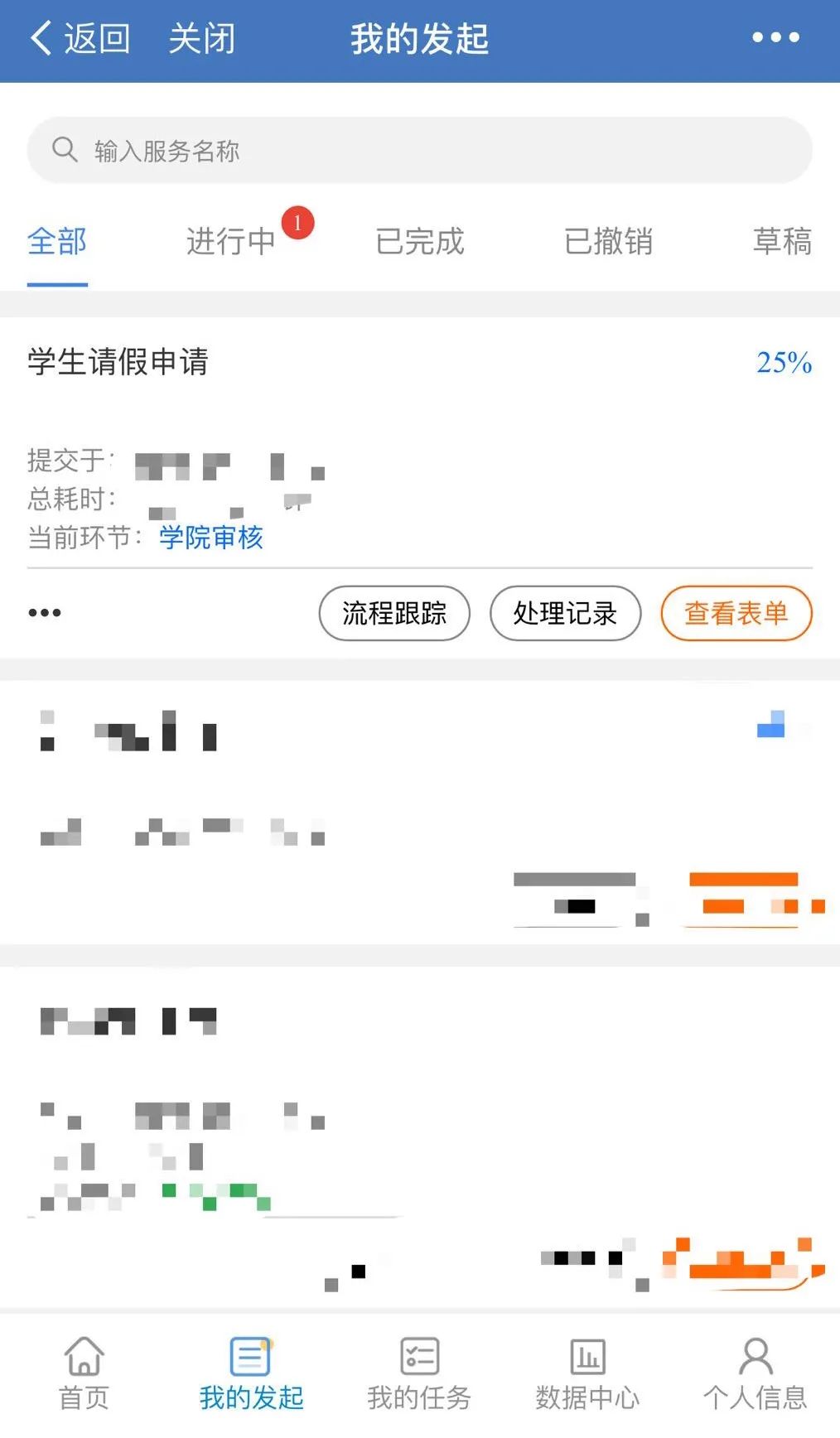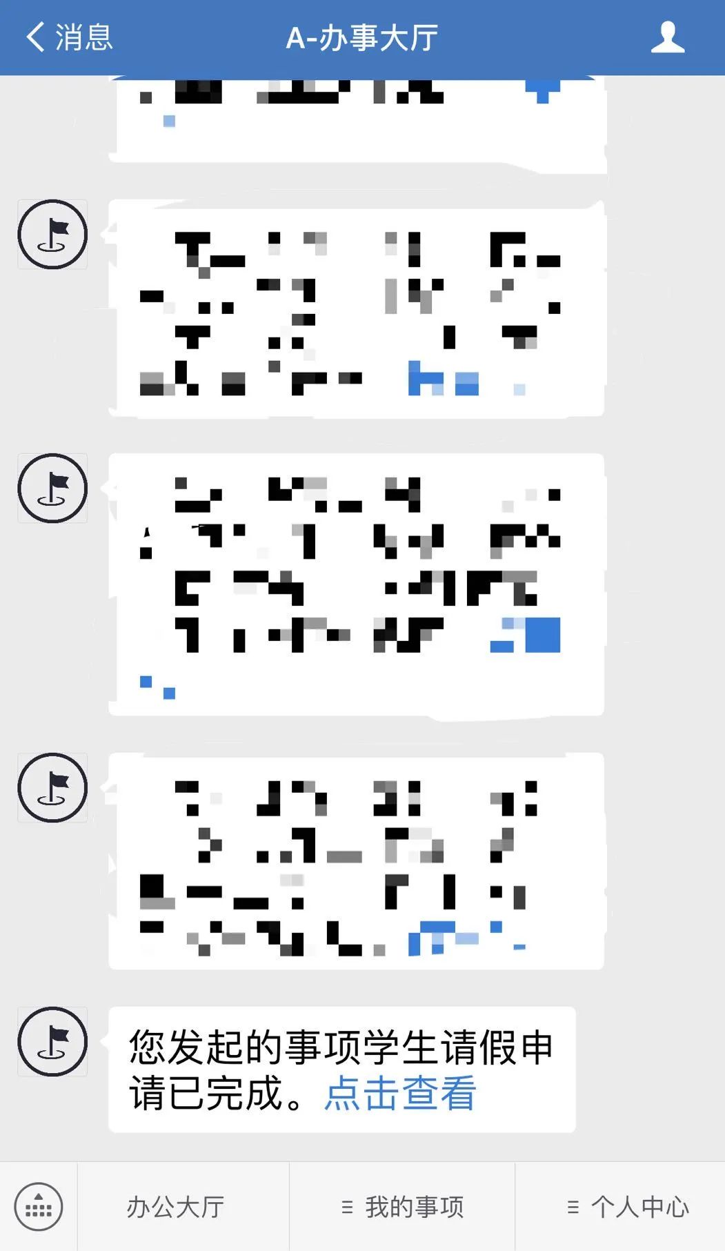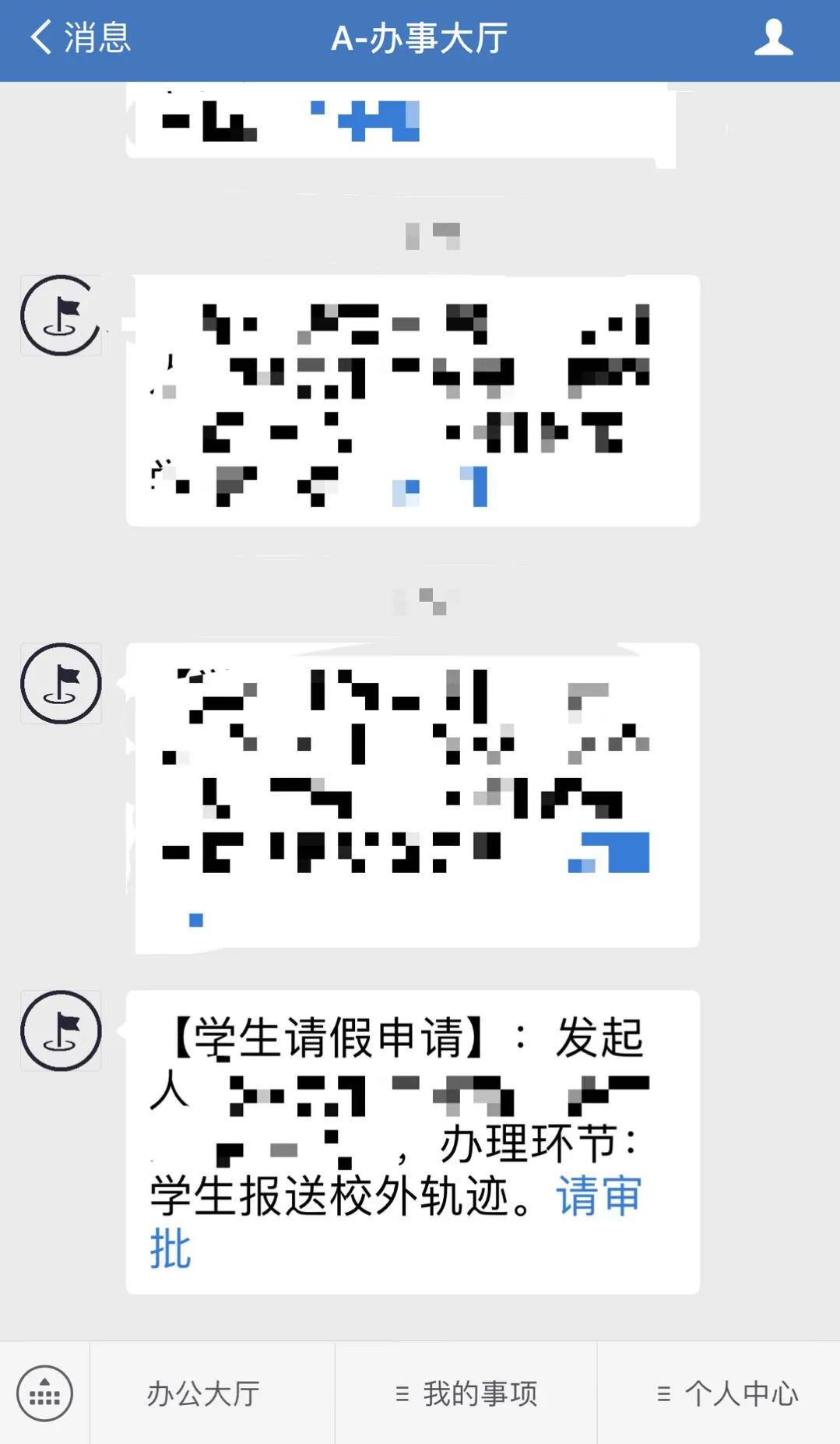 2.学院审核出校申请由学院辅导员和学院负责人进行审核,审核完成后,学生请假申请进入“学生报送校外轨迹”待报送环节。