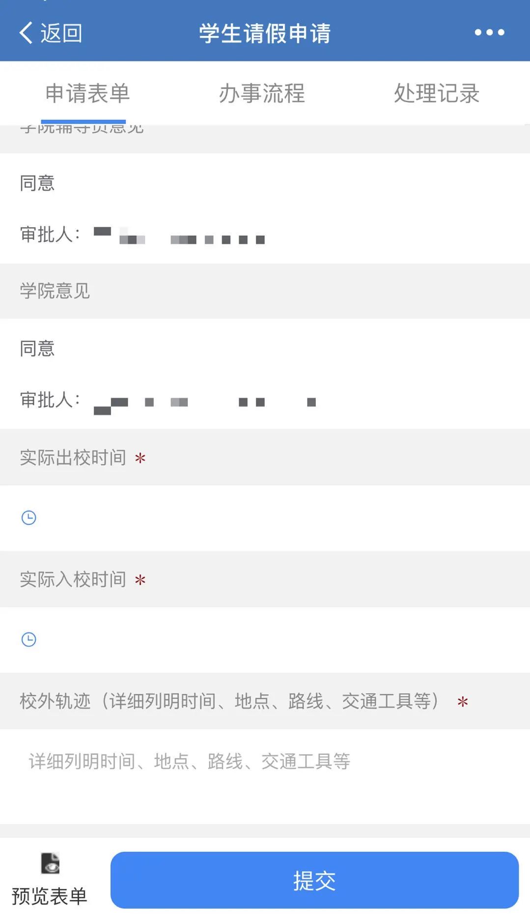 学生按照请假返校时间按时返校,及时在办事大厅填写校外具体出行轨迹,辅导员审核校外轨迹填写情况后,请销假流程完成。