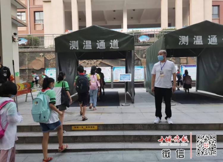 每天安排校务和文明劝导志愿者在校门口值班,引导学生有序通过校门口的测温通道进校园。班主任和搭班教师分别在教室前后门测体温,以及进入教室后辅导功课。