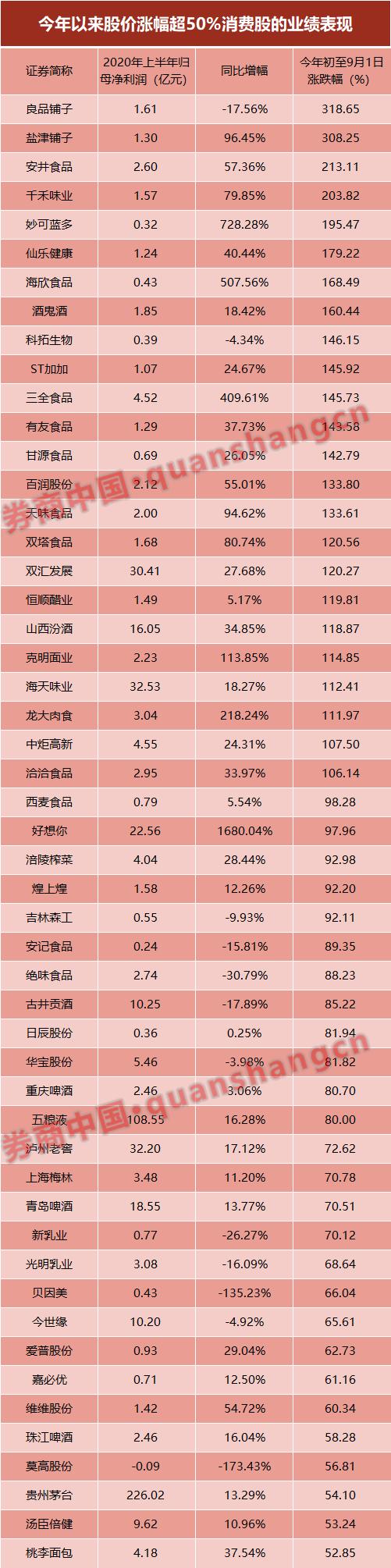 在资金推动下,消费股估值持续上升。根据券商中国记者梳理,今年7月以来,消费股市盈率超过45倍,估值开始突破历史数据;截至8月31日,食品饮料指数市盈率已经达到52.26倍,为近六年来新高。