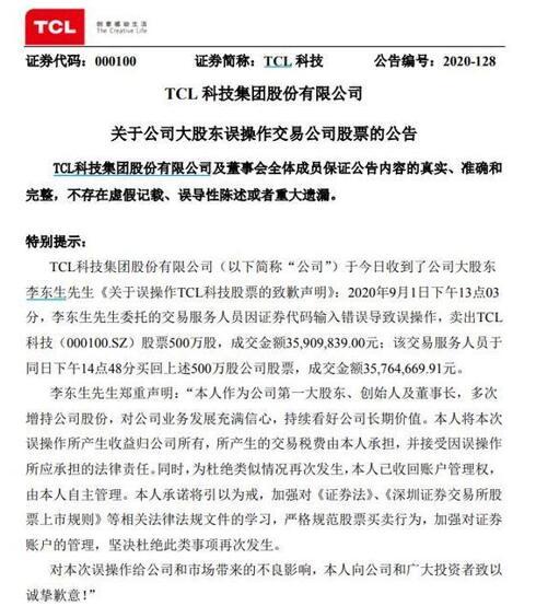 9月1日晚间,TCL科技发布公告称,公司于今日收到了公司大股东李东生先生《关于误操作TCL科技股票的致歉声明》: