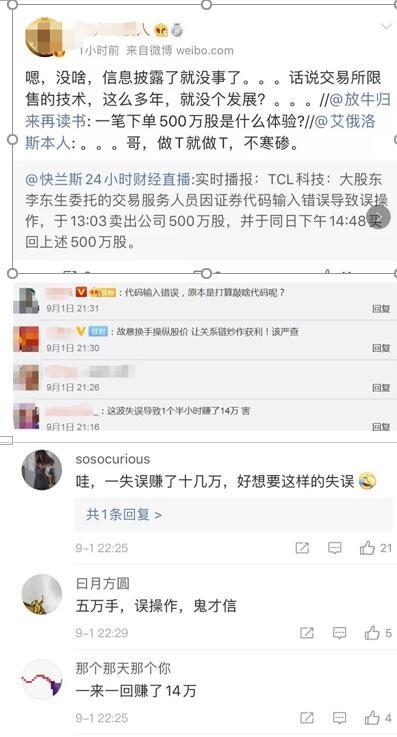 9月2日早上,#TCL大股东误操作卖出500万股#话题登上微博热搜榜第八名,截止写稿,该话题阅读量超1.4亿,超3000条讨论。