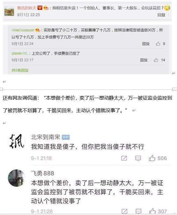 不过,也有网友评论道:“我相信是失误,一个创始人、董事长、第一大股东,会玩这花招?”“实际是亏了小二十万,买股票赚了十几万,按照法律规定被追缴三十万,还得自己承担手续费”。