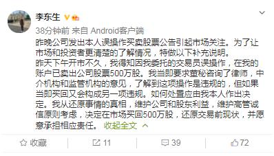 9月2日早上,李东生在个人的认证微博再次发声,他表示,在得知委托的交易员误操作以后,当即要求董秘咨询了律师、中介机构和监管机构的意见,了解到这是违规的,但是立刻买回来又会构成另一项违规。