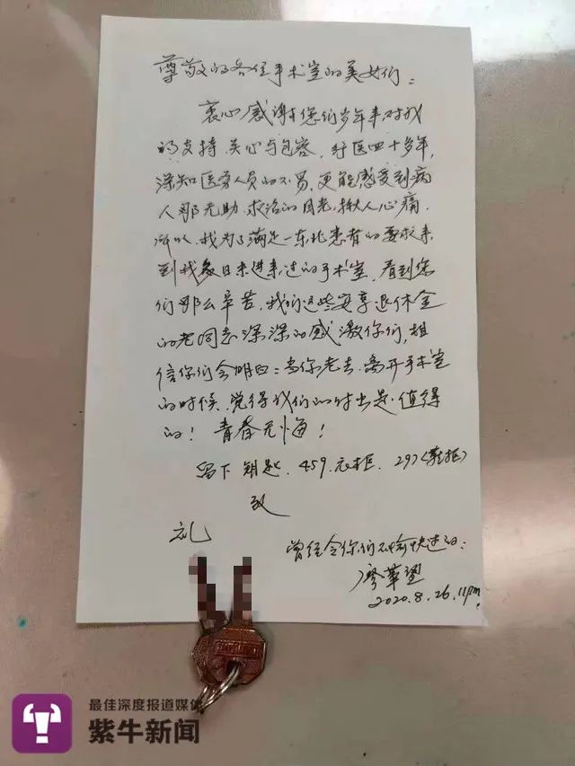 廖医生说手术完成后,脱下手术服,想着这应该是自己人生中最后一台手术了,当天晚上就交出了自己在手术室的衣柜、鞋柜钥匙。“当时已经是深夜,但我们科还有好几台手术要做。我看着同事们很辛苦,回想自己做医生四十多年都是这么过来的,于是就在一张纸上写了一些话,和钥匙一起放着,留给同事们。”