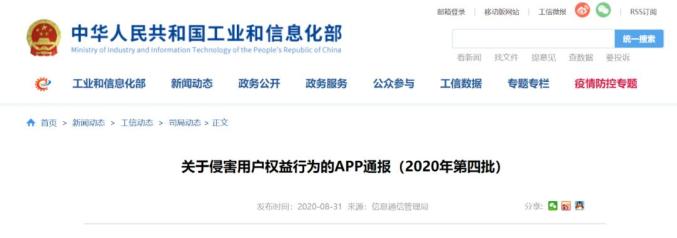 8月31日,工业和信息化部官网通报2020年第四批侵害用户权益行为的APP。依据《网络安全法》《电信条例》《电信和互联网用户个人信息保护规定》等法律法规,工业和信息化部近期组织第三方检测机构对手机应用软件进行检查,督促存在问题的企业进行整改。截至目前,尚有101款APP未完成整改。上述APP应在9月7日前完成整改落实工作,逾期不整改的,工业和信息化部将依法依规组织开展相关处置工作。