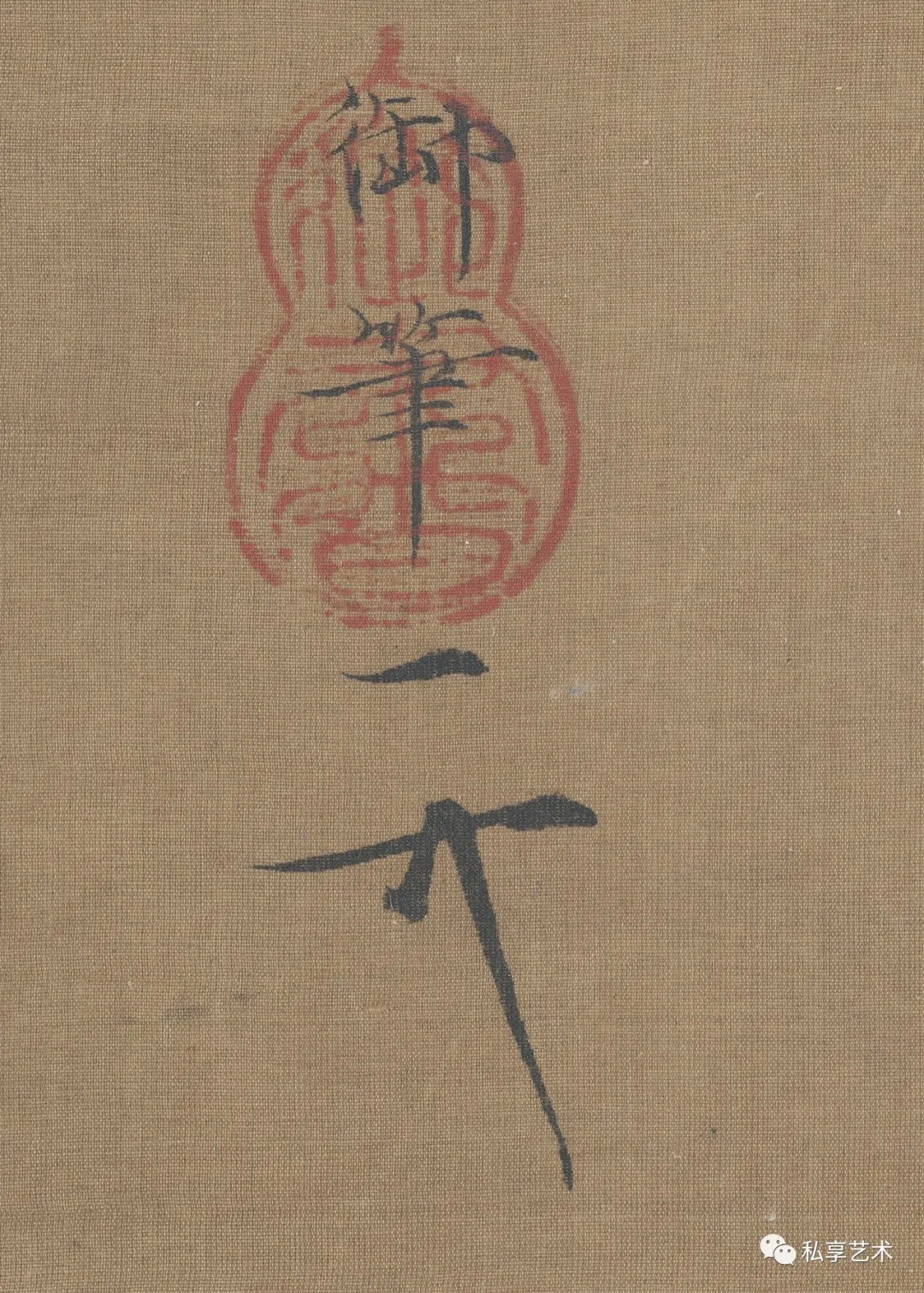 本幅款识:“御笔”、“天下一人”。钤“御书”朱文葫芦形印一方。鉴藏印钤“阿蒙秘笈”。