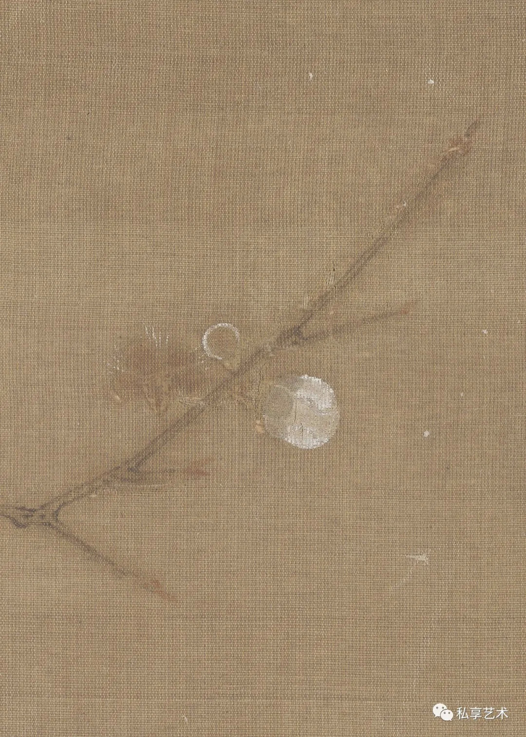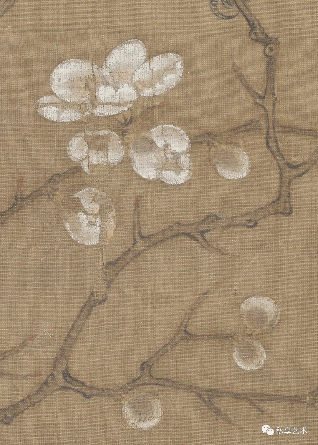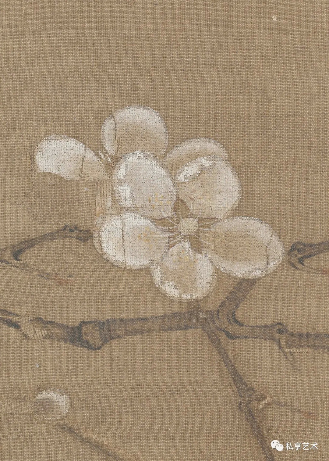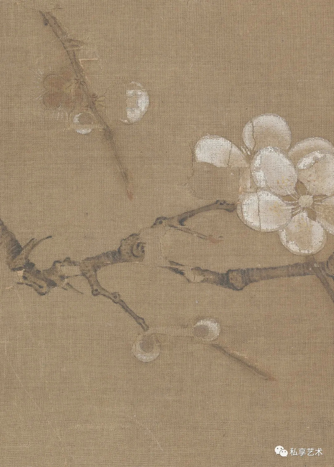 画中梅枝瘦劲,枝上疏花秀蕊,一只绣眼俏立枝头,鸣叫顾盼,与清丽的梅花相映成趣。所绘梅花为宫梅,宫中的梅花经过不断剪枝,人工修饰痕迹较重。此种梅的画法精细纤巧,敷色厚重,自有一种富贵气息,代表了皇家的审美意味。