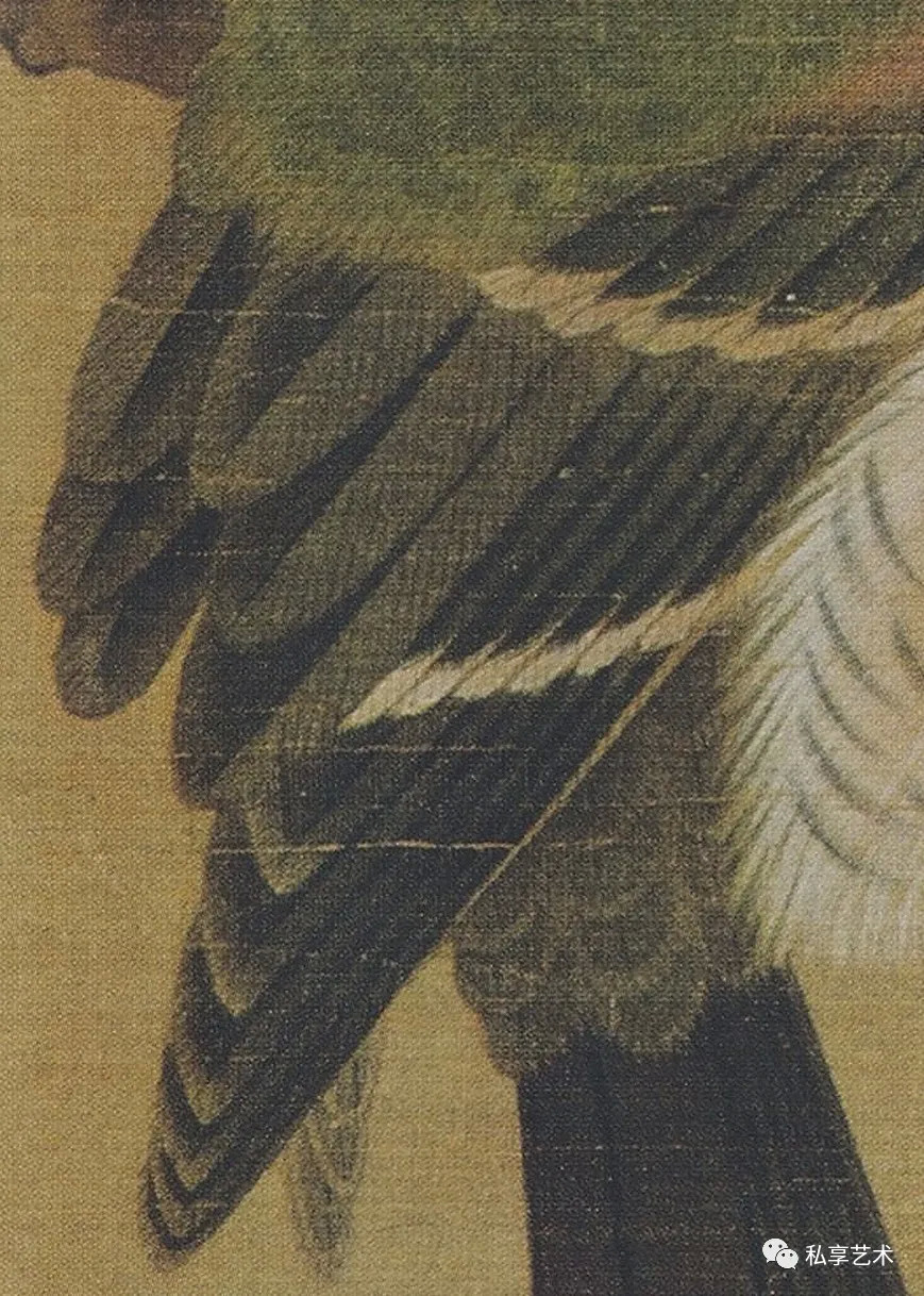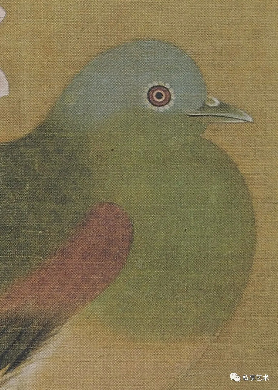 徽宗的画最初学吴元瑜。吴元瑜并非职业画家,也许正因为如此,没有什么束缚,对徽宗改革画院起到了一定的作用。《桃鸠图》描法纤细,傅染鲜润,与五代徐熙的水墨画要素和徐崇嗣的色彩为中心的没骨法花鸟比较接近。总的看来,色彩的表现给人以强烈的视觉感受,而细部的轮廓线仍非常明确。