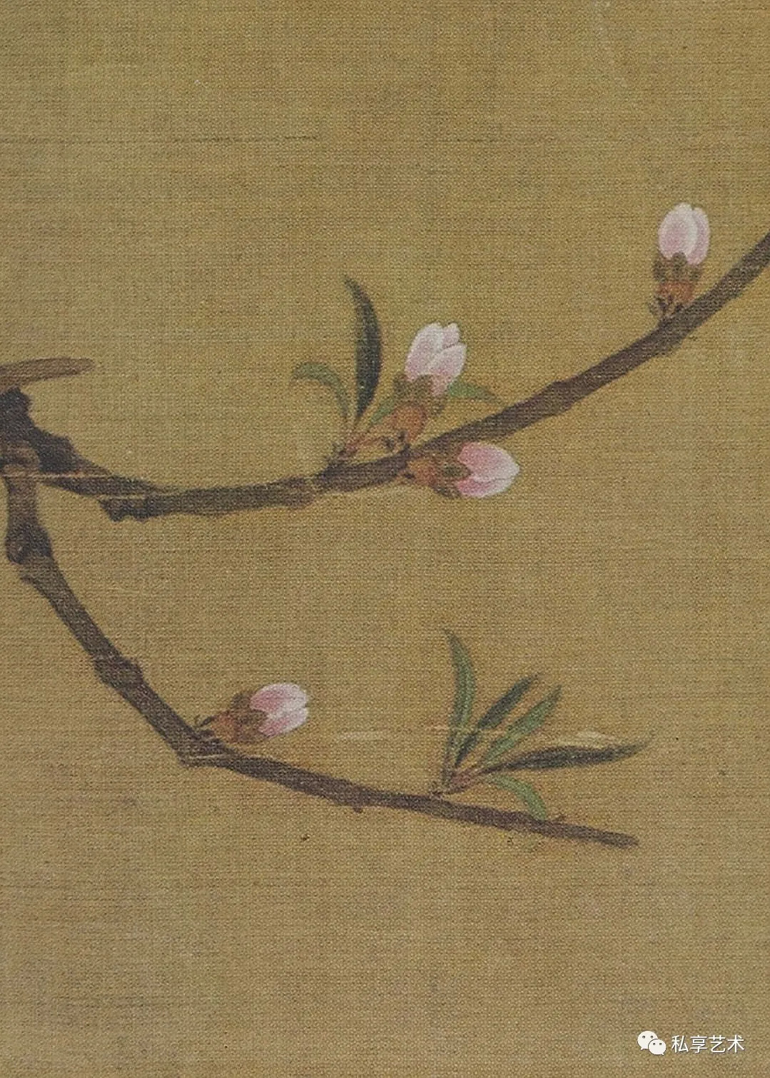 《桃鸠图》页在宋徽宗的作品中比较特别。桃花与枝叶钩勒精工,栖鸠动态自然而生动,用生漆点睛,卓有神采,整体色彩华丽,洋溢着悠扬的神韵,被誉为折枝花鸟画的典型。