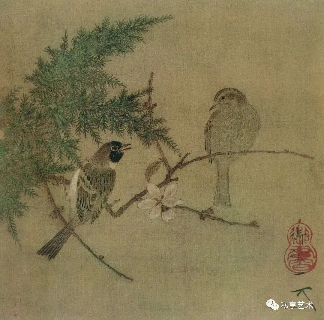 《腊梅双禽图》,绢本设色,纵25.8厘米,横26.1厘米,现藏于四川省博物馆。本画为宋徽宗赵佶的设色花鸟作品,画中右下角署有“御笔天下一人”的款识。该款识写法较为稚嫩,应属赵佶早年所作。画中描绘梅枝翠柏间两只停栖枝头的麻雀顾盼嬉闹的情景。徽宗笔下的两只麻雀表现得十分传神,一静一动,鸟的鸣叫仿佛透过画面传到观者的耳中。赵佶画鸟雀喜用生漆点睛,所以眼睛格外有神如活物一般,此画也不例外,同样使用了这种画法。从宋徽宗现存的花鸟小品来看,构图都是采用画面左边出枝的折枝式。这是一种在宋人花鸟画中常用的构图方式,从画面的左边往右画是比较符合右手的用笔习惯。此画与《桃鸠图》相比,虽同属工笔重彩画,但用色则较为清雅,审美趣味上更倾向于质朴的水墨风格,是研究宋徽宗画风流变的重要作品。