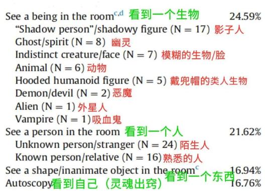 在一项对 185 位有过鬼压床经历的受试者调查后发现:大家普遍都出现了多种幻觉。