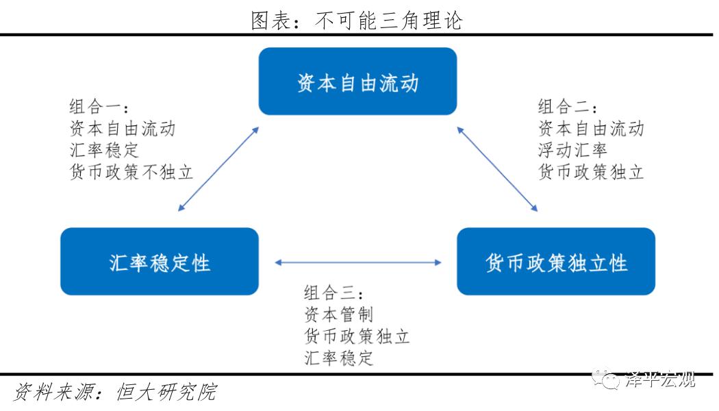 不可能三角又称三元悖论,指资本自由流动、汇率稳定性和货币政策独立性三个经济目标不可兼得,是经济体内外部政策选择的重要分析框架。基于不可能三角分析框架,存在三种不同政策组合。长期中,选择适合自身经济结构、发展阶段的汇率制度,对于经济体有着高度重要的意义。